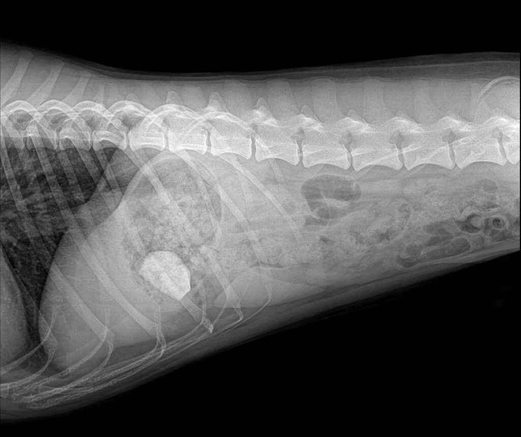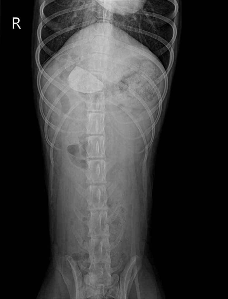 엑스레이 검사에서 위 내부에 밝은 음영의 물질이 확인되었으며, 형태와 밀도로 보아 돌 이물로 강하게 의심되는 소견이었습니다.이물의 크기와 위치상 자연 배출이나 구토 유도만으로는 제거가 어렵다고 판단되어 위절개 수술을 통한 이물 제거가 필요하다고 설명드렸습니다.